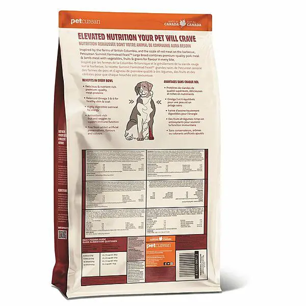 בהשראת רכסי ההרים של קולומביה, הבשר האדום על הברביקיו Petcurean Summit Farmstead Feast Large Breed משלב ארוחת חזיר וארוחת טלה באיכות פרימיום עם ירקות, פירות ודגנים בכל ביס.