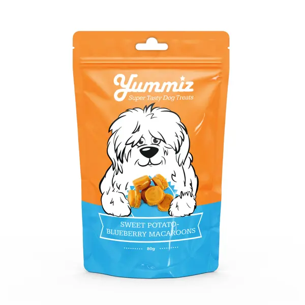 חטיף איכותי לכלבים, המשלב בטטה עם אוכמניות ליצירת טעם טבעי ומיוחד.