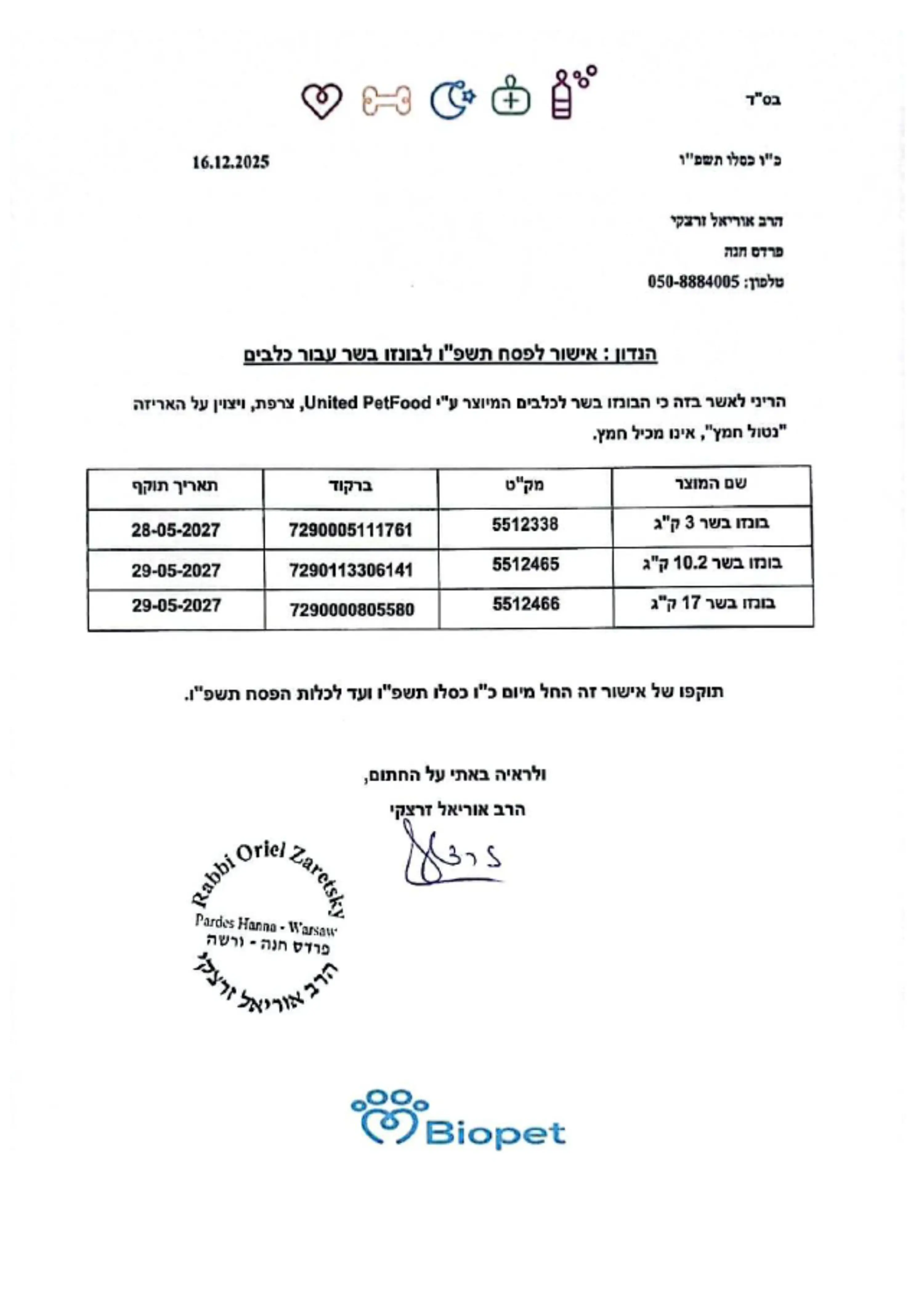 בונזו בשר לכלבים בוגרים - נטול חמץ Bonzo Dry Food for Dogs - Kosher for Passover