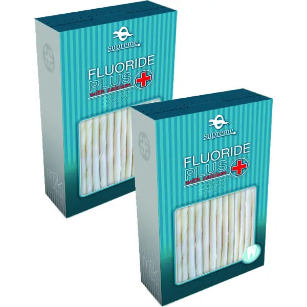 שני חטיפי בריאות לעסניות פלואוריד פלוס סידן מיוחד לכלבים תוצרת סופרים.