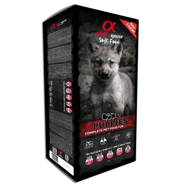 אוכל מלא וטבעי לגורי כלבים, מכיל אחוז גבוה של לחות (26%), מתאים לגורים מכל הגדלים לכל שלבי החיים, מזון לכלב אלפא ספיריט מכיל 85% של בשרים טריים, איכותיים ומעוררי תאבון (עוף, בקר, כבד, חזיר ודגים).