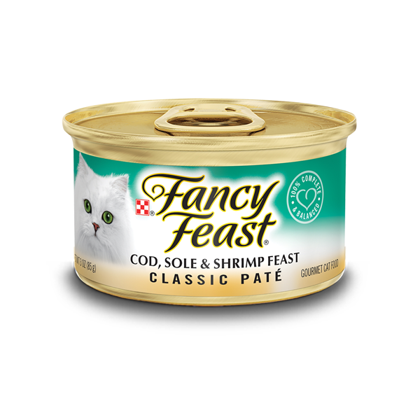 Fancy Feast פטה דג קוד, סול ושרימפס, מזון לח המעניק לחתולים 100% תזונה מלאה ומאוזנת לצד ארוחת גורמה במרקם עשיר ומפנק במיוחד, כמו שחתולים אניני טעם אוהבים!