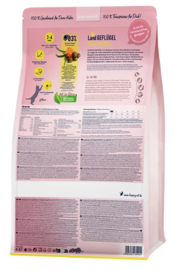 מרכיבים: עוף מיובש בהידרוליזה חלקית, קמח תירס, שומן עוף, בשר, קמח אורז, פתיתי תפו"א, סלמון, תאית, דבשת סלק מיובש נטול סוכר, פוטוסיום כלוריד, שמרים יבשים, ביצה מיובשת, סודיום כלוריד, רסק תפוחי עץ, אצות ים מיובשות, פשתה, יוקה שידגרה מיובש, תמצית שורש עולש, תמצית שמרים יבשים, גדילן, ארטישוק, ג'ינג'ר, עלי לבנה, סרפד, קמומיל, כוסברה, רוזמרין, מרווה, שורש ליקריץ, תימין.