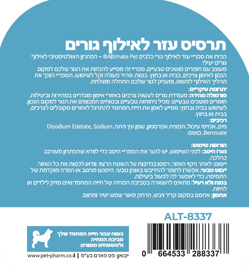 התרסיס של Altimate Pet מעניק לכם פתרון פשוט, בטוח ויעיל שיקל על התהליך ויעזור לגור להתרגל לשגרה נכונה, גם בבית וגם בחוץ.