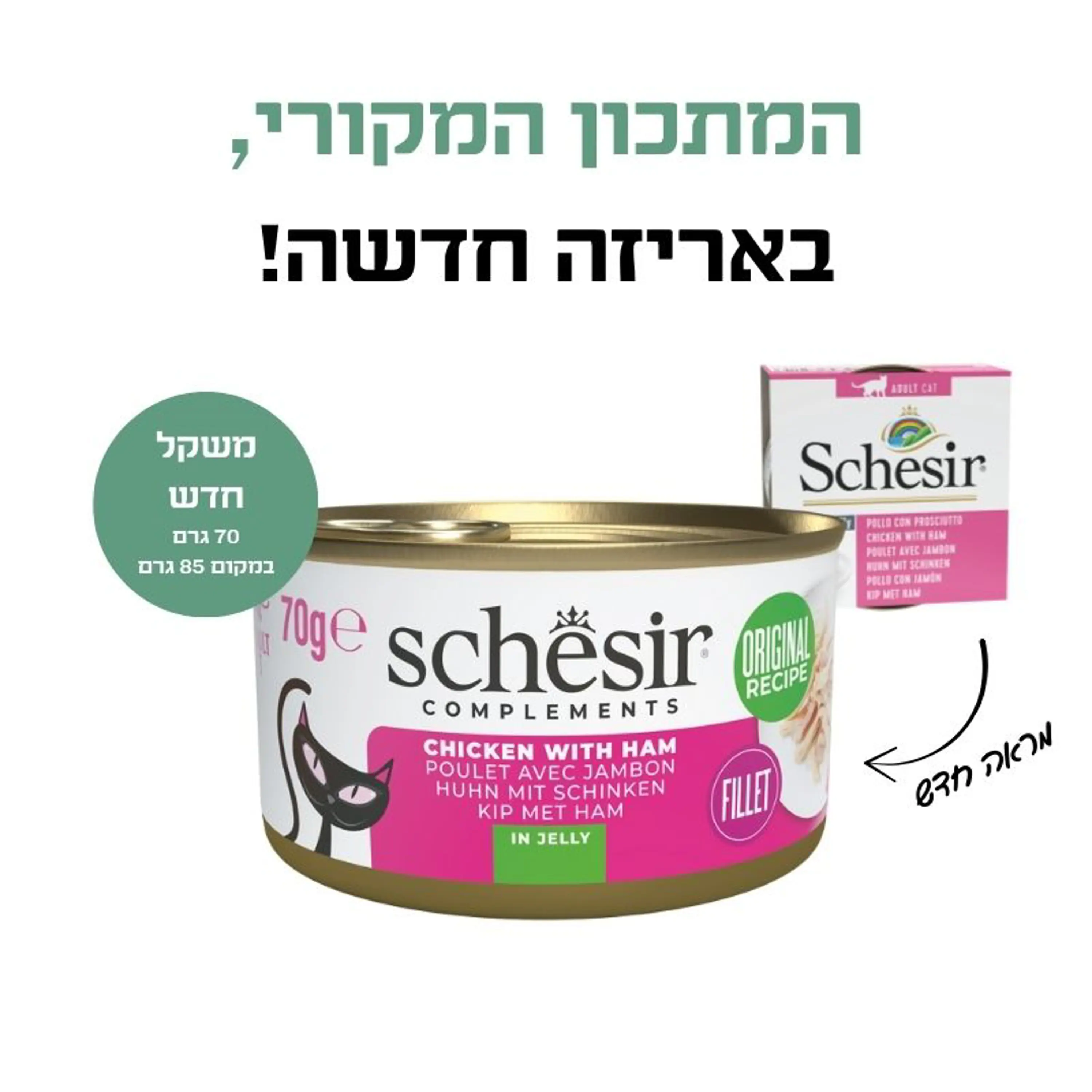 למה לבחור בקו החדש של המזונות הרטובים לחתולים: המשכיות בטעם ובריח המוכרים: תוך כדי ששיפרנו את הפרופיל התזונתי, שמרנו על הטעם והריח המוכרים של המוצרים שלנו, כך שהחתול שלך יזהה את הטעמים והמרקמים שהוא כבר אוהב. חדשנות עם כבוד למסורת: עיצוב האריזה החדש משקף את ההתפתחות של המוצר תוך שמירה על הזהות שהפכה את Schesir למותג אמין בקרב בעלי חתולים. בידול מהמתחרים: השילוב של מרכיבים טבעיים, היעדר תוספים מלאכותיים והפרופיל התזונתי המשופר הופכים את התזונה המלאה של Schesir לבחירה ייחודית.