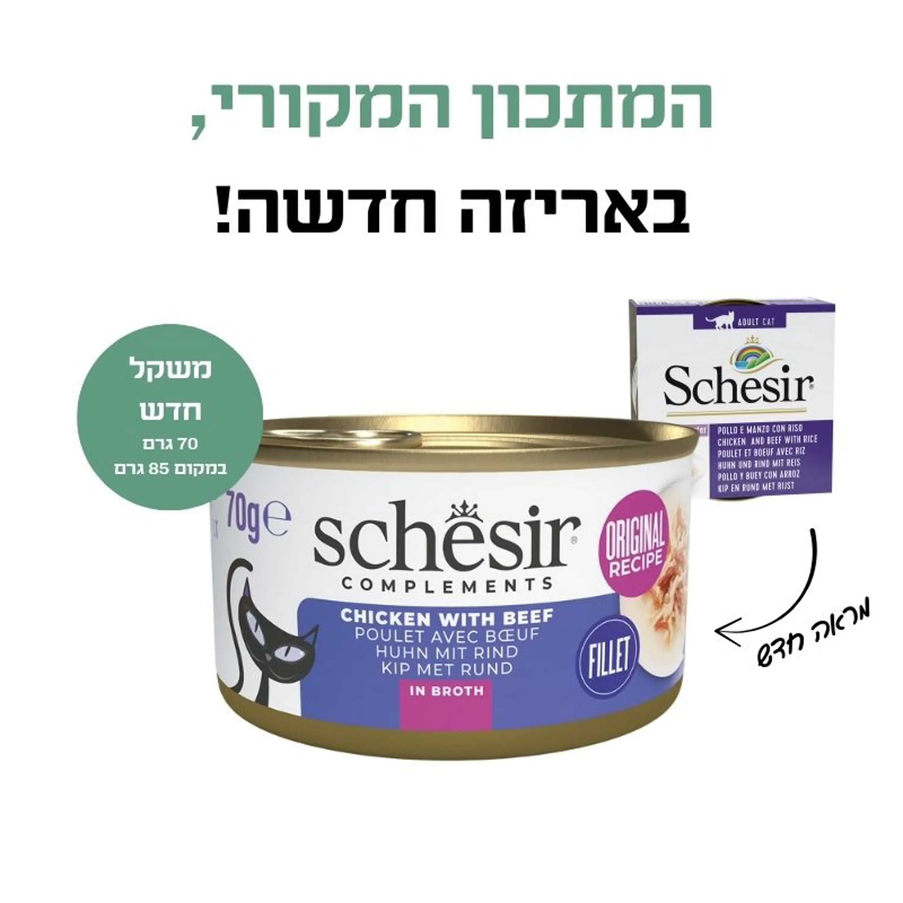 למה לבחור בקו החדש של המזונות הרטובים לחתולים: המשכיות בטעם ובריח המוכרים: תוך כדי ששיפרנו את הפרופיל התזונתי, שמרנו על הטעם והריח המוכרים של המוצרים שלנו, כך שהחתול שלך יזהה את הטעמים והמרקמים שהוא כבר אוהב. חדשנות עם כבוד למסורת: עיצוב האריזה החדש משקף את ההתפתחות של המוצר תוך שמירה על הזהות שהפכה את Schesir למותג אמין בקרב בעלי חתולים. בידול מהמתחרים: השילוב של מרכיבים טבעיים, היעדר תוספים מלאכותיים והפרופיל התזונתי המשופר הופכים את התזונה המלאה של Schesir לבחירה ייחודית.